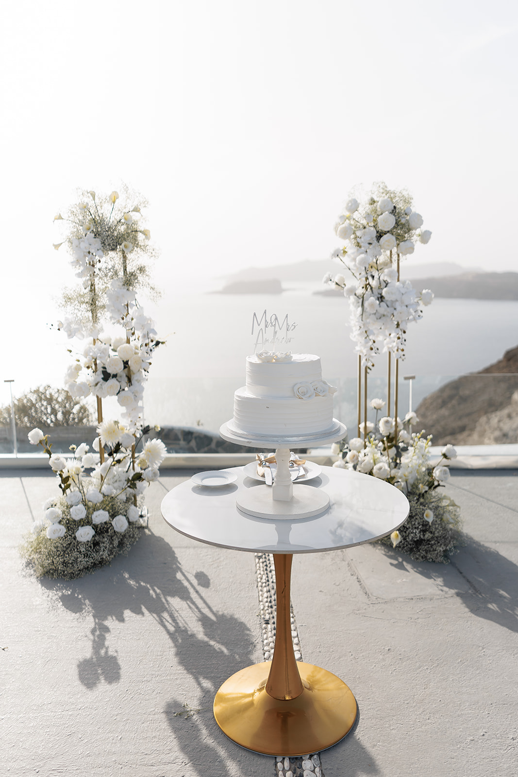 The ceremony featured two golden floral columns, adding height and elegance to the serene setup. Adorned with soft white blooms by Amela Flowers, they reflected the calm beauty of the island. Their gentle design framed the couple with grace, blending nature and style in perfect harmony.