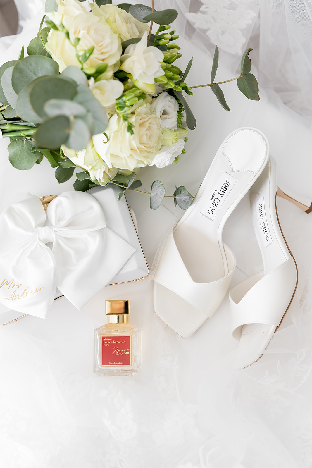 Her ivory gown flowed like silk, featuring lace-trimmed off-the-shoulder sleeves and a perfectly sculpted bodice. Delicate embellishments shimmered gently, echoing the day’s serene elegance and dreamy atmosphere. Her gossamer veil fluttered in the breeze, completing her fairy-tale look with poetic charm.