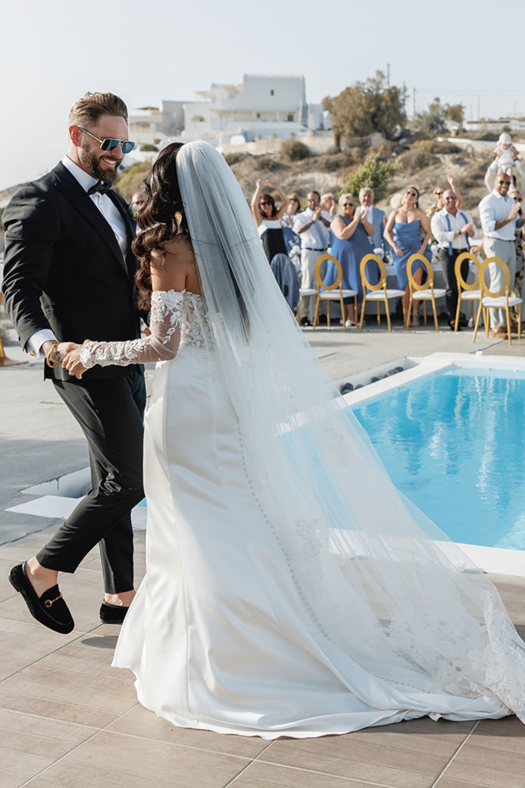 Selecting the perfect venue is more than just a decision. It’s the heart of an elegant wedding in Santorini. For Mohini and James, Thermes Luxury Villas was a serene sanctuary, where whitewashed walls met the deep blue of the Aegean Sea. Their symbolic ceremony and celebration unfolded beside a shimmering pool at the villa’s center, framed by graceful olive trees that added natural Cycladic charm to the minimalist decor. Their soulful ceremony was led by Kosta Savva, a deeply experienced and eloquent wedding celebrant and officiant, whose warm presence brought even more meaning to their vows.