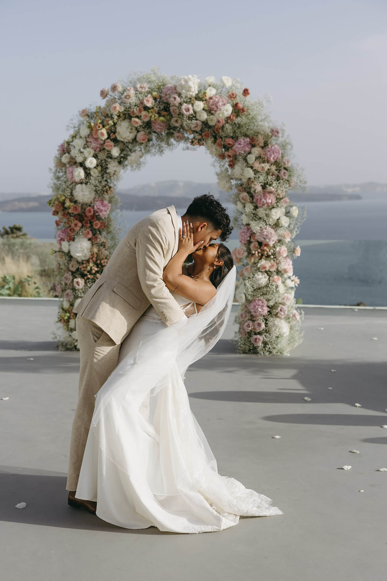 Beneath a delicate arch of white and blush blooms, softened by natural textures, they exchanged vows in a scene that felt both cinematic and grounded. The atmosphere was calm, the light was bright, and every detail whispered intentional beauty. For couples on the hunt for a Santorini wedding venue that blends privacy with polish, Le Cote is a dream come true.